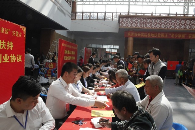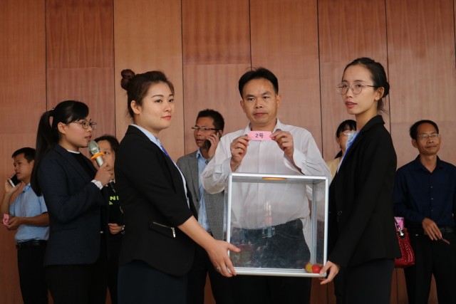 在工人员宣读抽签分房流程后,开始抽签分房。首先由各乡镇领导代表以乡镇为单位抽签确定贫困户选房顺序,再由贫困户逐户进行抽签选房并确认。当天,经过核验材料、抽房号、登记信息、签订合同等一系列程序后,参加此次来宾市兴宾区易地扶贫搬迁“老乡家园”安置点分房仪式的455户贫困户,除36户因材料核验未通过外,419户都抽到了新房。除抽签分房外,当天,就业服务中心还与每户贫困户签订了就业培训协议,兴宾区工管委领导与贫困户签订帮扶协议。