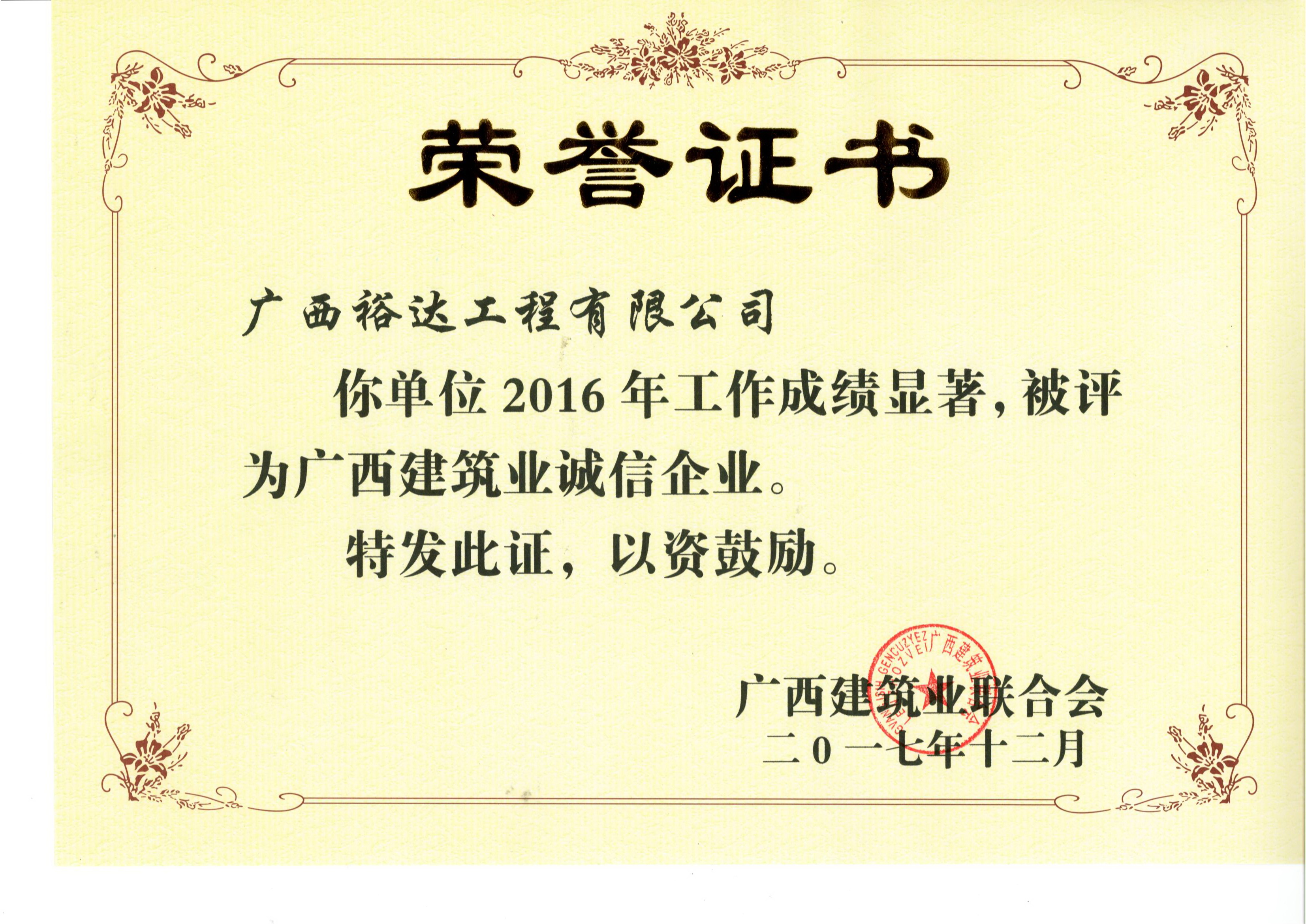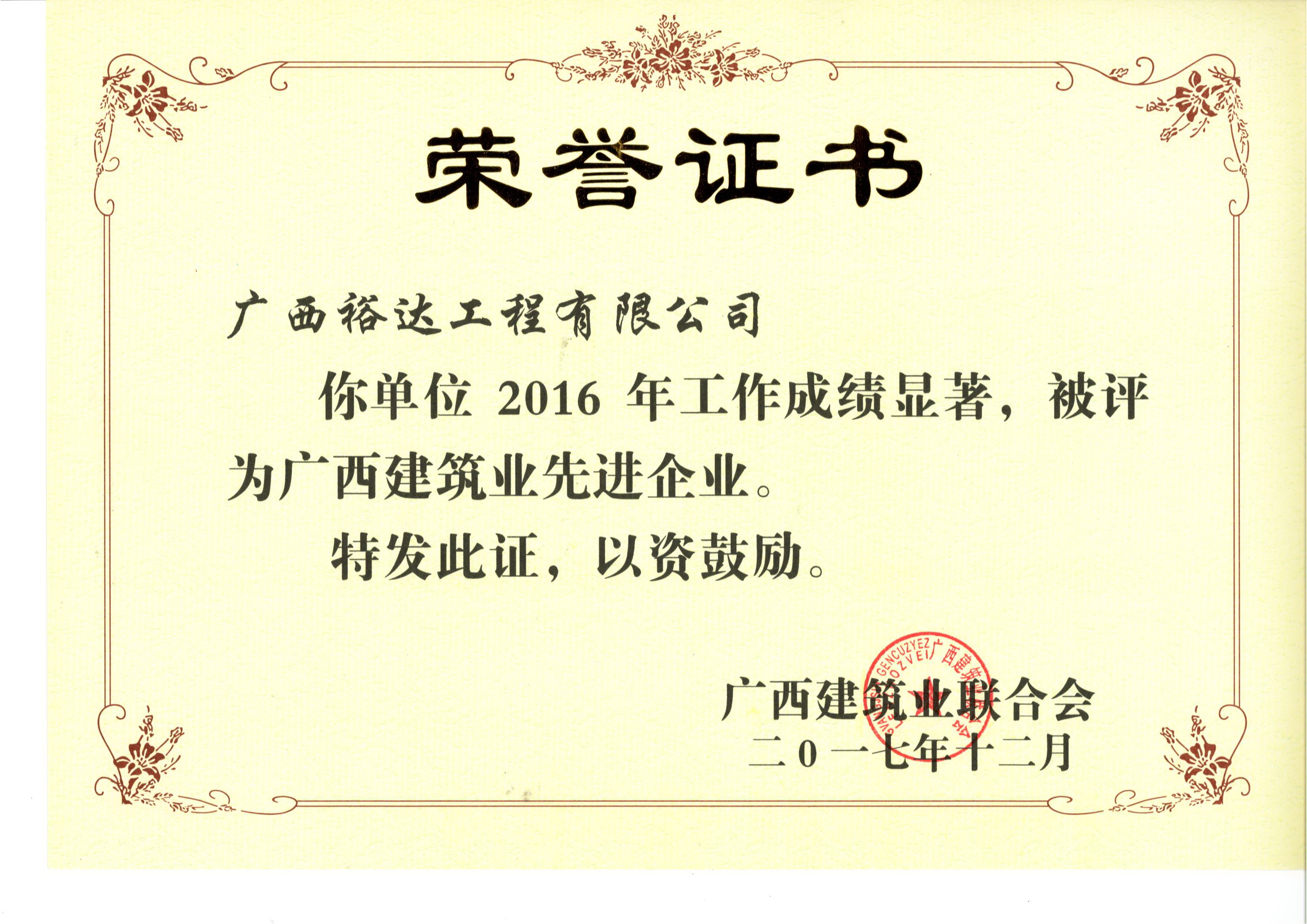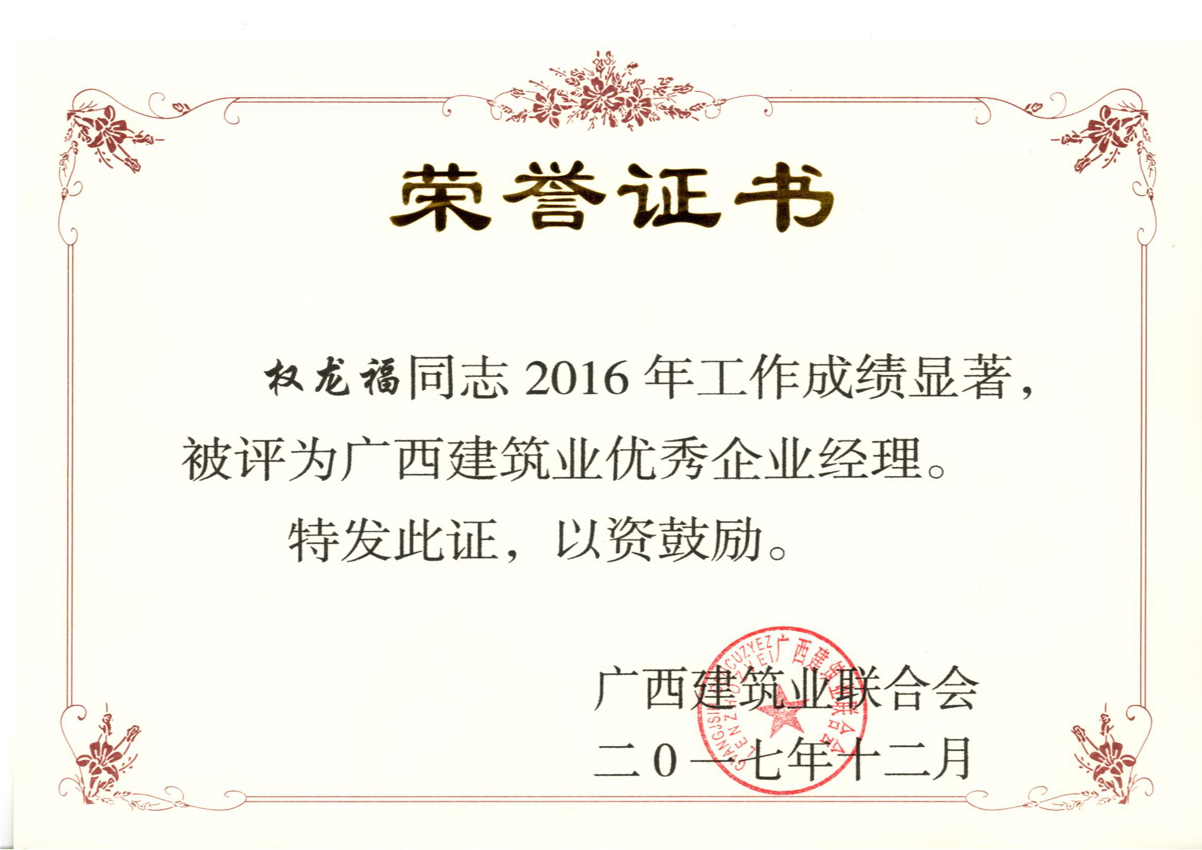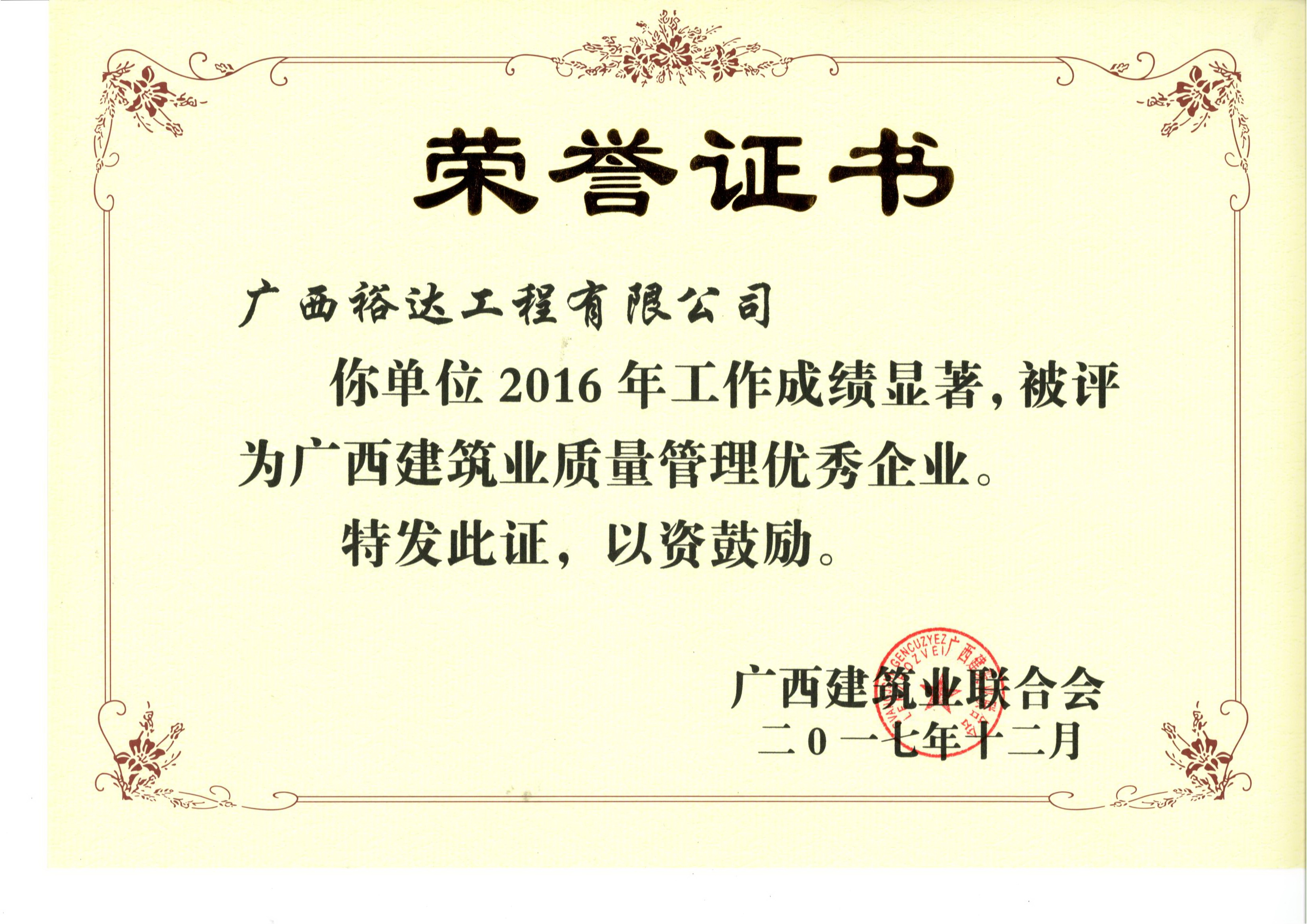 据悉,大会对广西建筑行业2016年度的先进企业和优秀个人进行表彰,我公司继2015年度后再获2016年度“广西建筑业先进企业”、“广西建筑业诚信企业”、“广西建筑业质量管理优秀企业”、“广西建筑业安全生产先进企业”和“广西建筑业绿色施工先进单位”等荣誉称号。我公司总经理权龙福被评为“2016年度广西建筑业优秀企业经理”,我公司韦延力、覃其成、胡凌毅、左居顽共4位同志被评为“2016年度广西建筑业优秀建造师”,我公司彭菱、韦秋凤、覃其成、胡凌毅、韦凤玲、陈春佑、左居顽、冼学军、卢洋、段菁、覃登年共11位同志被评为“2016年度广西建筑业安全生产先进工作者”。这些荣誉的背后是公司全体员工辛勤的汗水和默默无闻奉献的结果,是公司积极践行“工匠精神”的重要肯定,是公司的综合实力的不断提升和行业良好的信誉的充分体现,再次将裕达工程的品牌影响力和竞争力提上新的台阶。