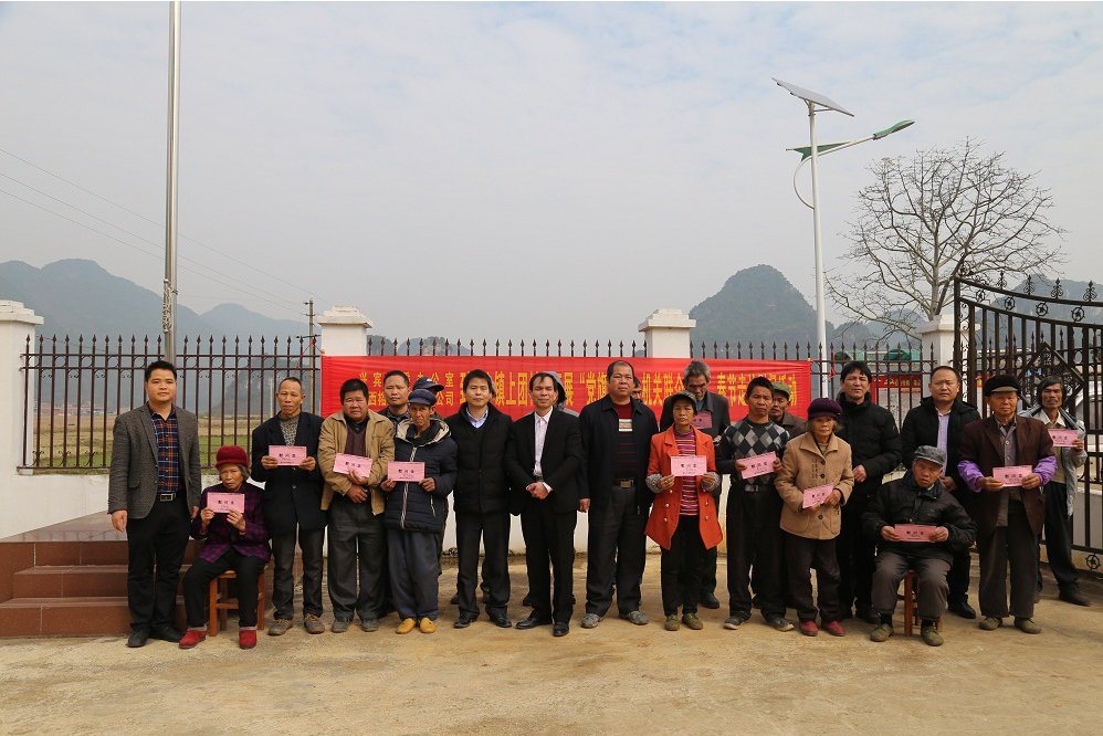 为深入贯彻落实党的十九大精神,坚决打赢脱贫攻坚战。2019年1月22日集团公司党支部代表来宾裕达慈善基金会联合兴宾区委办到集团公司结对帮扶点来宾市兴宾区寺山镇上团村委开展春节走访慰问活动,集团党支部书记谢家伟组织支部部分优秀党员与兴宾区委办杨杰副主任等一行共同参加本次慰问活动。