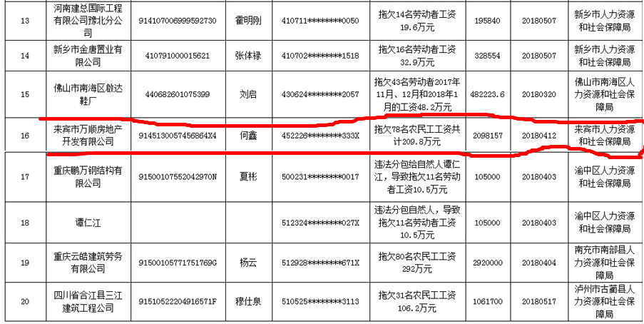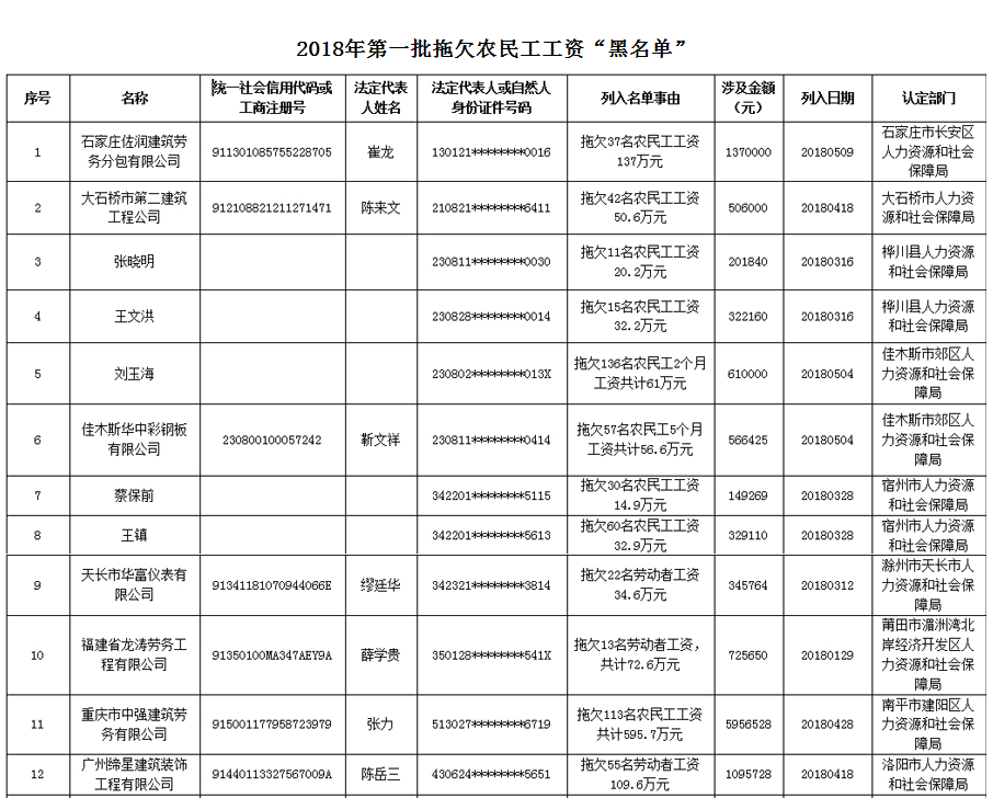 建立和实施拖欠农民工工资“黑名单”制度,加大对拖欠工资违法失信行为的惩戒力度,是保障农民工工资支付的一项重要举措,是推进企业工资支付诚信体系建设的重要内容,也是健全源头预防、动态监管和失信惩戒相结合的工资支付制度保障体系的重要手段。为此,20179月,我部专门制定印发了《拖欠农民工工资“黑名单”管理暂行办法》,于今年11日起施行。201711月,我部又与发展改革委、人民银行、住房城乡建设部等30个部门和单位联合签署印发了《关于对严重拖欠农民工工资用人单位及其有关人员开展联合惩戒的合作备忘录》。各地人社部门结合本地实际,制定出台相关实施细则,依法开展拖欠农民工工资“黑名单”认定工作,并实行跨部门联合惩戒。近期,我们在各地提供情况的基础上,梳理了第一批拖欠农民工工资“黑名单”,共涉及14家违法企业和6名违法人员,今天在此将这些违法企业和个人向全社会予以公布。