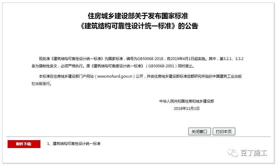 现批准《建筑结构可靠性设计统一标准》为国家标准,编号为GB50068-2018,自2019年4月1日起实施。其中,第3.2.1、3.3.2条为强制性条文,必须严格执行。原《建筑结构可靠度设计统一标准》(GB50068-2001)同时废止。