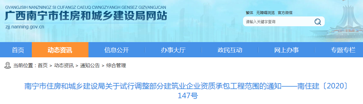 5月11日,南宁市住建局发布《关于试行调整部分建筑业企业资质承包工程范围的通知》,自2020年5月10日起施行。