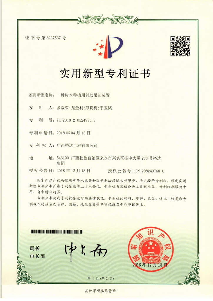 2018年实用新型专利证书(一种树木种植用辅助吊起装置)