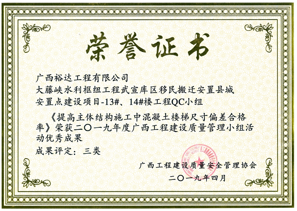 2019年度广西工程建设质量管理小组活动优秀成果《提高主体结构施工中混凝土楼梯尺寸偏差合格率》