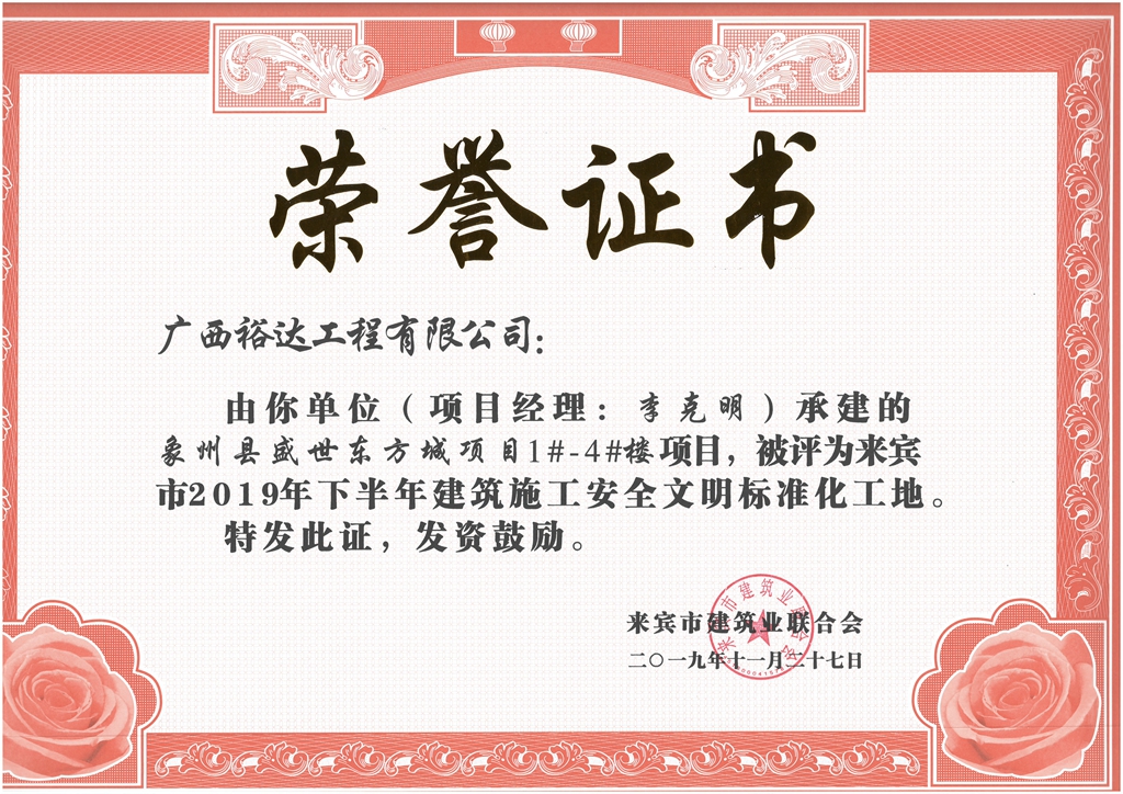 象州县盛世东方城项目1#-4#楼项目被评为来宾市2019年下半年建筑施工安全文明标准化工地(项目经理:李克明)